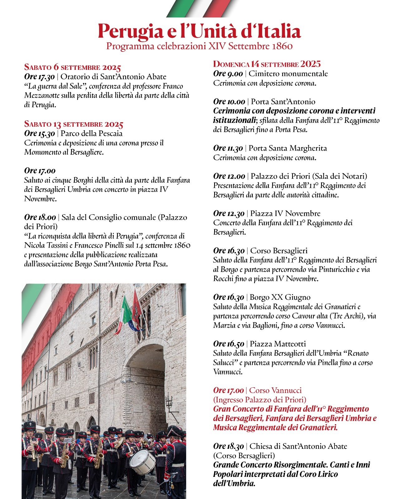 Con Deliberazione della Giunta comunale n. 300 del 24 agosto 2022, il Comune di Perugia ha deliberato, tra l’altro, “di riconoscere il valore per la città di Perugia della ricorrenza del 14 settembre 1860, data in cui i granatieri ed i bersaglieri liberarono Perugia dalle truppe pontificie, facendo irruzione da Borgo Sant’Antonio e, conseguentemente, di annoverare detta data fra le ricorrenze cittadine”.